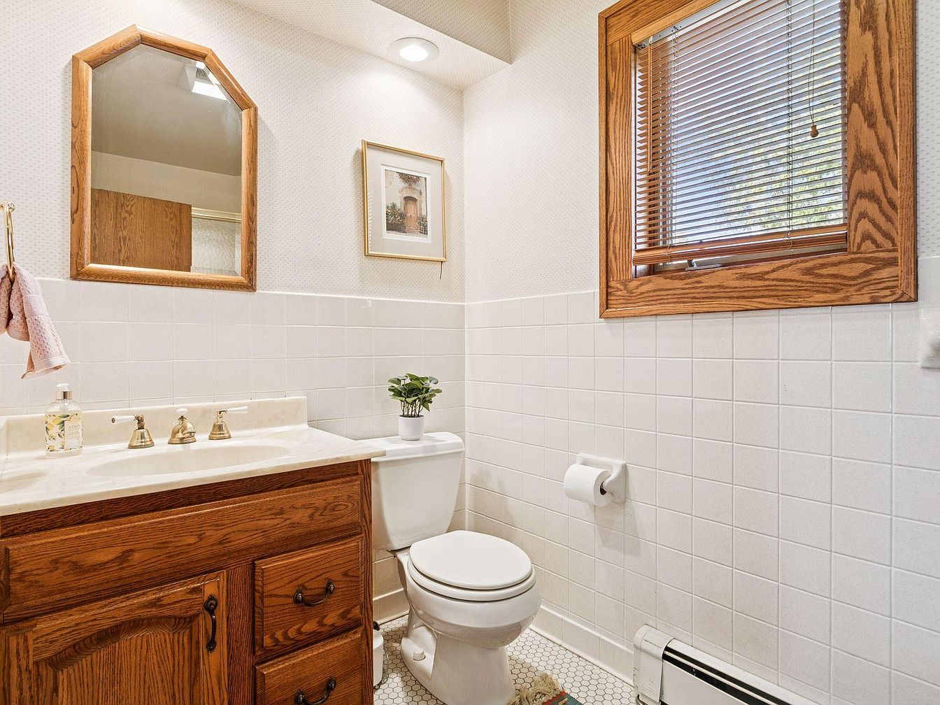 A compact bathroom features a warm, traditional aesthetic with oak wood cabinetry, a matching wood-framed mirror, and wood trim around the window with horizontal blinds. The vanity countertop is a cream-colored marble, complemented by brass fixtures and a classic white sink. The lower half of the walls is covered in white square tile, while the upper half has subtle textured wallpaper. Above the toilet sits a small potted plant for a touch of greenery. A towel ring holds a pale pink towel, and a framed piece of art hangs on the wall, adding visual interest to the clean and inviting space.
