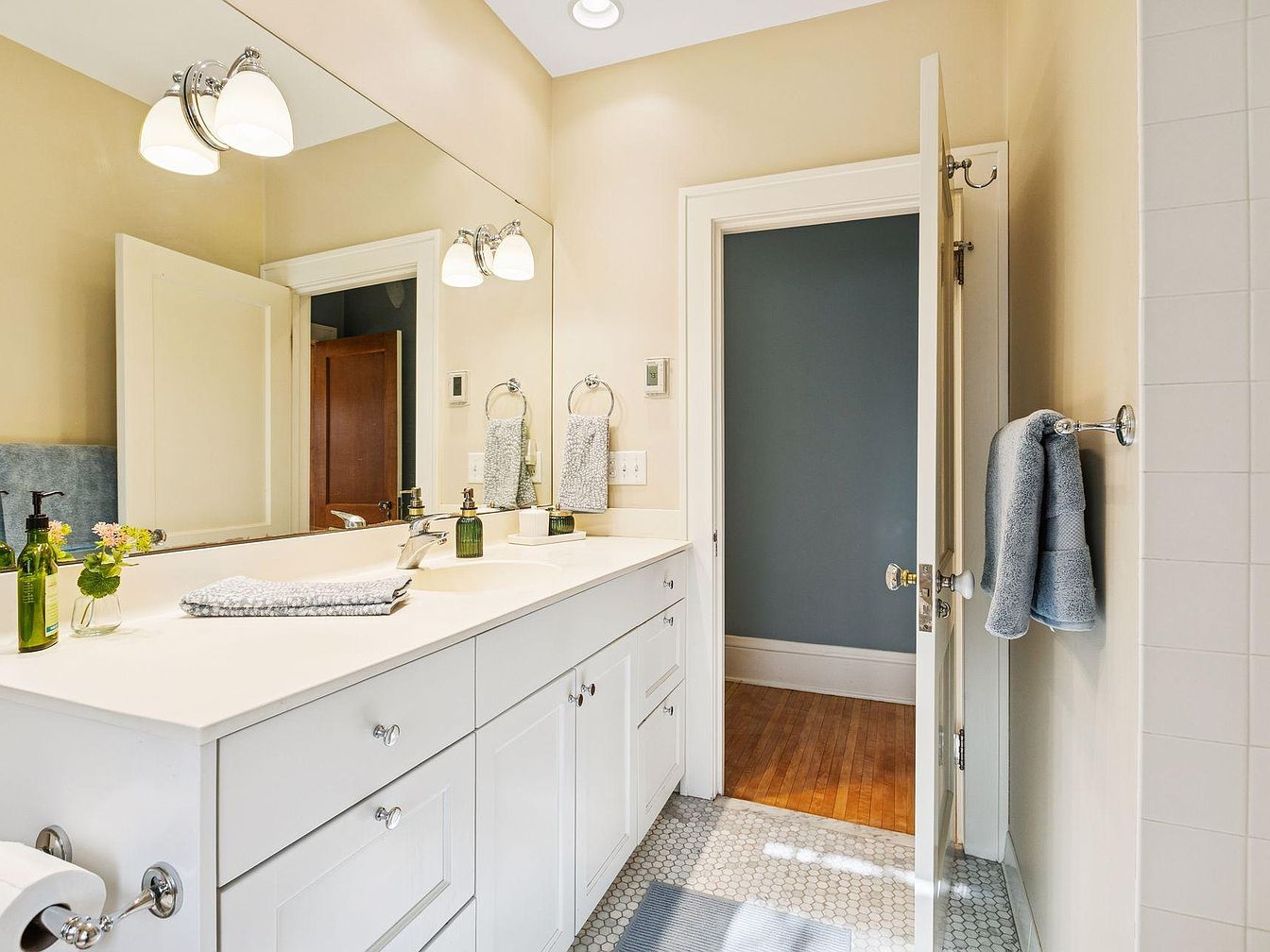 A long, white double-sink vanity with shaker-style cabinets stretches along one wall, topped by a seamless countertop. Above, a large wall-to-wall mirror is illuminated by two classic chrome light fixtures with frosted glass shades. The walls are painted a warm, buttery beige, contrasting with cool gray and white hexagonal floor tiles. Stainless steel towel rings and bars hold neatly folded gray towels, while accessories like a soap dispenser, fresh flowers, and a stack of hand towels add touches of green and soft texture. An open door reveals a hardwood hallway painted in muted blue, blending old and new aesthetics.