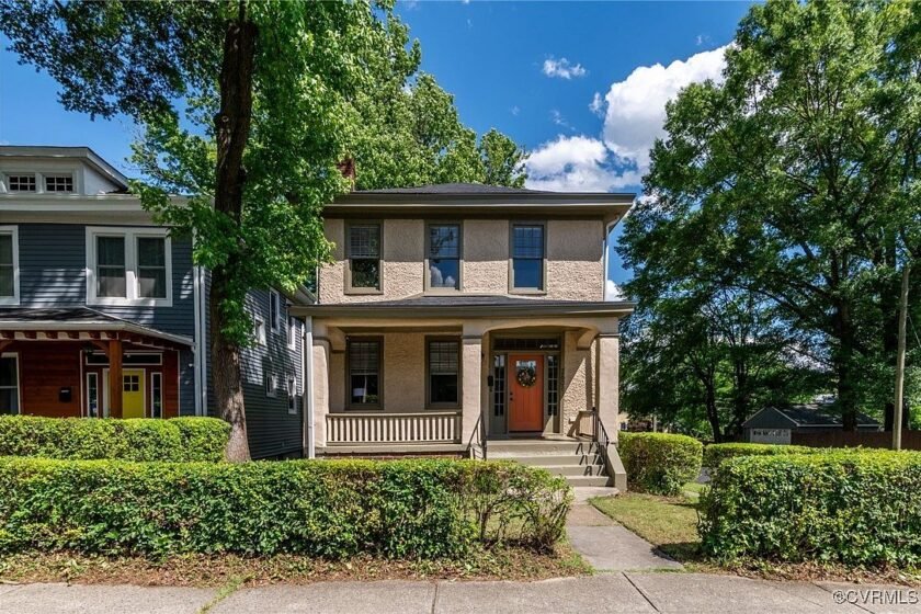 A two-story historic American home sits on a corner lot with a surrounding hedge delineating the property. The house has a textured beige stucco finish with a symmetrical front facade featuring three second-floor windows and a central front door below. A small covered porch supported by round columns and a simple railing adds charm to the entrance area. The door is painted a warm orange, drawing attention and adding a pop of color. Mature trees provide shade, while neighboring homes display varied siding materials and colors, contributing to the neighborhood’s classic, established ambiance.
