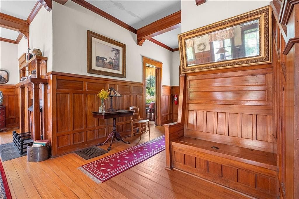 Richly stained wooden paneling lines the walls from floor to shoulder height, complemented by matching wood floors and decorative crown molding. A built-in wooden bench with high back occupies the right side beneath a large, gold-framed mirror. Adjacent, an antique writing desk holds a lamp and a simple vase with yellow flowers, paired with a wooden chair. Above the desk hangs a framed print depicting horses. A long, narrow red rug with a floral border stretches across the floor. Natural light filters through a doorway in the background, softening this warm, traditional entry space.