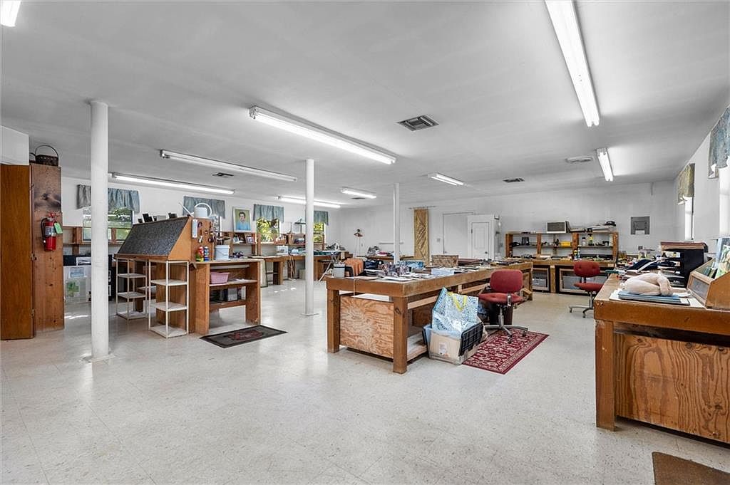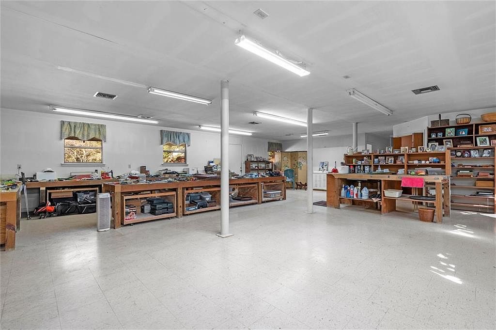 A spacious, utilitarian workshop with a large open floor plan and high, flat white ceiling punctuated by exposed fluorescent lighting. The flooring is practical linoleum, accented by stark white supporting columns. Three substantial wooden workbenches span one wall under two small windows dressed with green valances, letting in natural light. At the back, wooden shelving holds assorted supplies, framed photographs, and baskets, suggesting a blend of function and nostalgia. Various tools, containers, and hobby materials are visible, giving the space an industrious yet personalized feel. The neutral color palette ensures a clean, organized, and purposeful atmosphere.