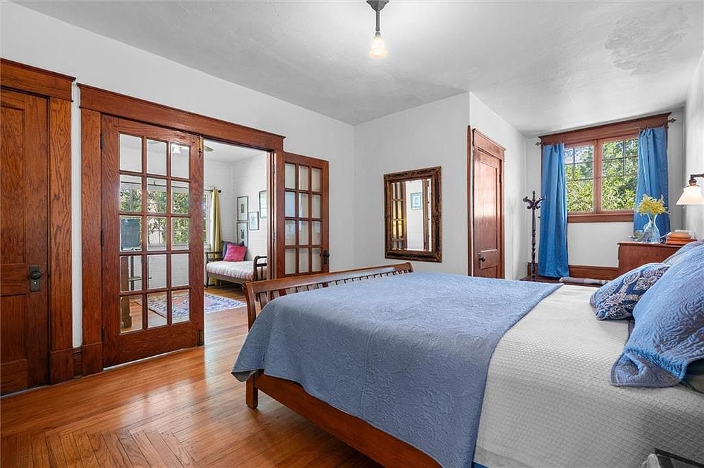 A spacious bedroom features polished hardwood floors and white walls, creating a bright, airy atmosphere. The centerpiece is a wooden bed dressed in light blue and white linens with patterned accent pillows. Deep wood trim frames doors and windows, adding warmth and character. To the right, a large window is adorned with vibrant blue curtains, allowing natural light to stream in. A wooden dresser sits beneath the window, topped with fresh flowers in a glass vase. At the foot of the bed, double French doors with glass panes lead to a cozy adjoining sitting area with comfortable furnishings and rug.