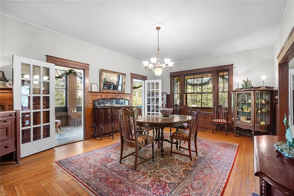 A spacious dining room with a classic, early 20th-century aesthetic featuring rich wood trim, wainscoting, and detailed window framing throughout. The room centers around a round wooden dining table with matching chairs atop a large, patterned Persian rug that adds warmth and color. Large multi-paned windows with wood accents bathe the space in natural light and offer exterior views. Built-in display cabinets and buffets, filled with fine china and collectibles, line the walls and provide elegant storage. French doors with glass panels open to an adjoining room, enhancing both light and flow between spaces. A vintage chandelier completes the traditional ambiance.
