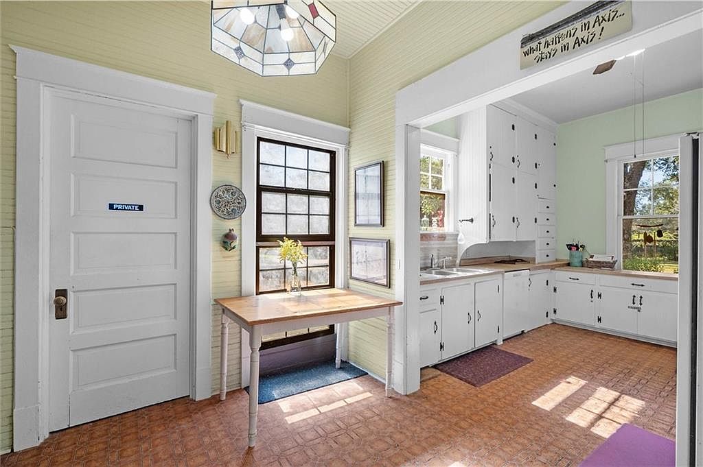 A cozy transitional space leads into a vintage kitchen with white cabinetry and a U-shaped countertop layout. The walls are painted pale yellow in the entry and light green in the kitchen, adding a cheerful warmth. A small wooden table sits by a large, divided-pane window, topped with a simple vase holding flowers. Decorative plates and framed art hang on the wall, while a white paneled door marked ‘PRIVATE’ stands nearby. The ceiling features beadboard paneling and an angular stained glass light fixture. The floor is covered in terra-cotta colored linoleum, and sunlight streams in through multiple large windows, creating a bright, inviting atmosphere.
