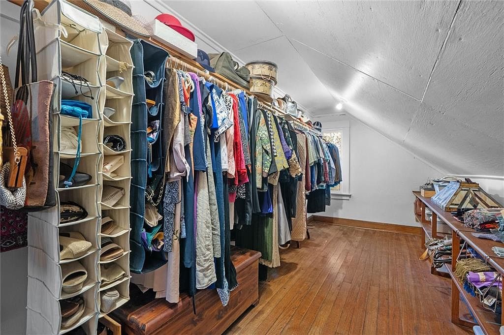 A long, narrow walk-in closet is set under the sloped ceiling of an attic space. Natural wood floors span the length of the room, with crisp white walls and ceiling reflecting ambient light. A row of open shelving for shoes and accessories stands to the left, with a rack of colorful, vintage-style clothing hanging above a wooden bench. On the right, a wooden table runs the length of the wall, neatly arranged with folded garments, handbags, and hat boxes. The single window at the end allows daylight to brighten the cozy, organized space, creating a warm and inviting atmosphere.