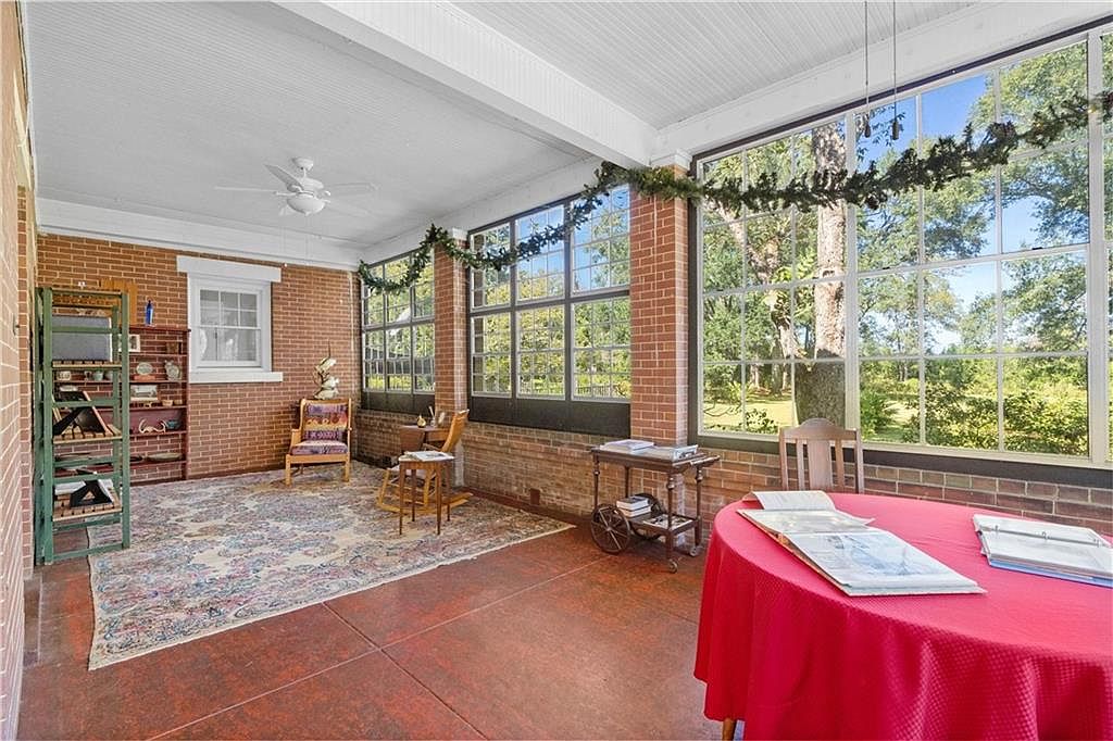 A spacious sunroom features an expanse of large windows framed by rich red brick walls, allowing natural light to flood the space and providing clear views of the surrounding greenery. The floor is finished in an earthy terracotta color topped with an ornate area rug by the door. Ceiling fans line the white beadboard ceiling, and a garland is strung decoratively across the window frames, adding a festive, inviting touch. Toward one end, a round table draped in a deep red tablecloth is surrounded by wooden chairs, creating a cozy nook for gathering, reading, or enjoying nature indoors.