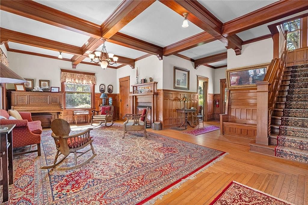 Spacious living area featuring rich wood paneling and exposed beam ceilings, lending a warm and historic feel. Walls are half-paneled in oak, the upper half painted cream, resulting in a cozy yet elegant contrast. Vibrant Persian-style area rugs cover part of the polished hardwood floor, coordinating with deep red upholstered armchairs and a period-appropriate loveseat. A carved wooden staircase with patterned runner leads upstairs, flanked by built-in seating. Decorative moldings, chandeliers, vintage artwork, a piano, and antique side tables contribute to the classic atmosphere, reflecting early 20th-century American design and craftsmanship.