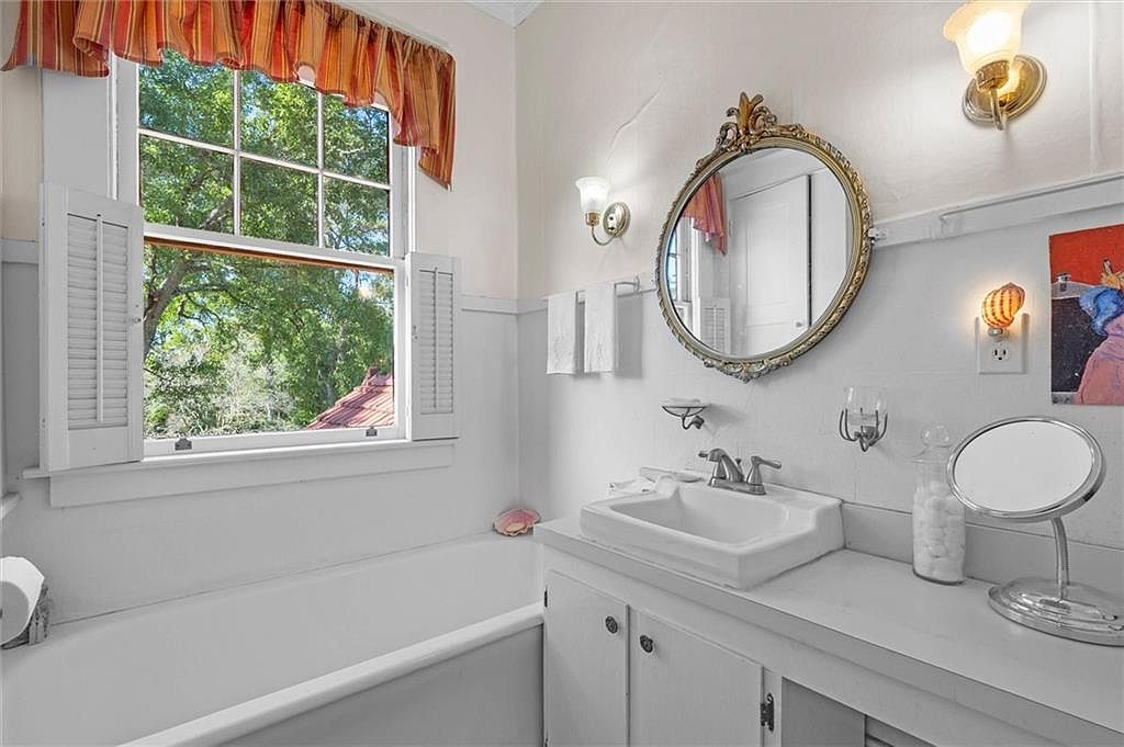 A cozy bathroom is dressed in soft white hues and vintage accents. A classic white bathtub with clean lines sits beneath a large window trimmed with plantation shutters and a gingham ruffled valance in warm orange and red. The window frames vibrant green trees outside, adding a touch of nature. The vanity features an oval sink with silver fixtures atop a broad countertop, which is topped with a glass jar of cotton balls and a round double-sided mirror. Prominent on the wall is an ornate gold-framed round mirror, flanked by two antique-style sconces that cast a warm, inviting glow. Subtle wall art and careful detailing evoke a timeless charm.