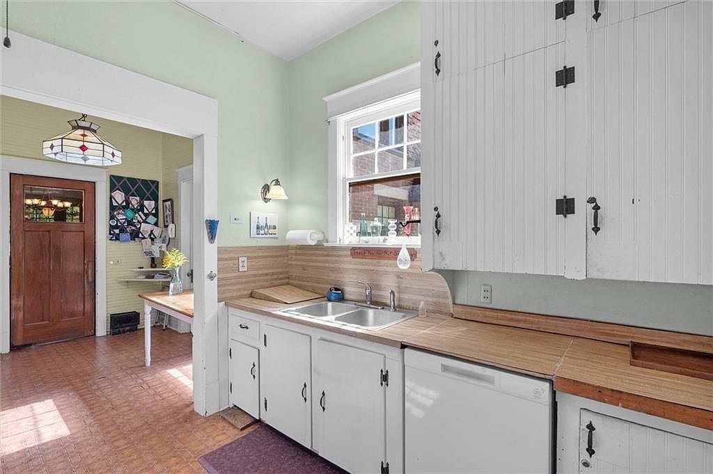 A quaint kitchen corner showcases a deep stainless steel sink set in wood-trimmed laminate countertops. Tall, beadboard cabinets with vintage black hardware line the wall above, painted in crisp white. Muted green walls complement the overall homey, cottage-style aesthetic. Natural light streams through a double-hung window over the sink, offering a clear view outside and illuminating the workspace. To the left, a small table holds a vase of yellow flowers, nestled under a stained glass ceiling light and adjacent to a wooden door. The floor is covered in red-brown patterned linoleum, adding warmth and character.