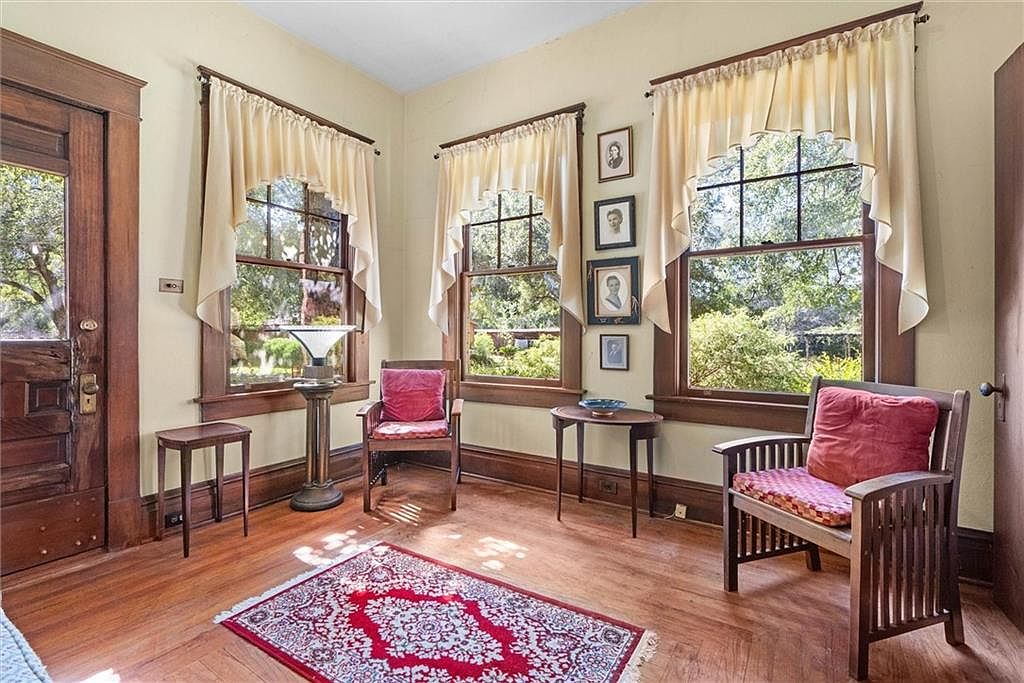 A cozy sitting area featuring two large windows and a side door, each framed by rich dark woodwork and cream-colored drapes. Sunlight brightens the warm wooden floor, complemented by a red and white patterned rug at the center. Two wooden chairs with red cushions flank an elegant round accent table. A classic brass lamp sits atop a small table to the left, offering a touch of vintage charm. The neutral yellow walls are adorned with four framed portraits between the windows, enhancing the nostalgic, welcoming atmosphere. Outside, lush green foliage can be glimpsed through the clear windowpanes.