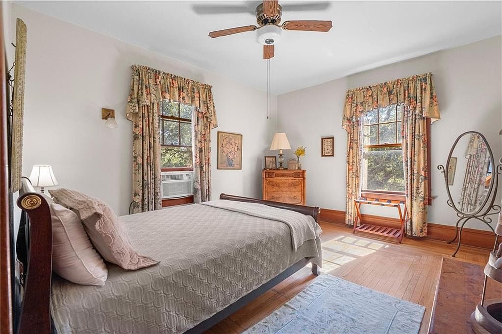A sunlit bedroom featuring a large wooden sleigh bed with pale, textured linens and plush pillows. The walls are painted a soft neutral, and two tall windows are dressed with floral-patterned valances framing the view of lush greenery outside. Rich wood trim along the floor and window frames lends warmth, complemented by a honey-colored wood chest of drawers beside a table lamp. An oval standing mirror with delicate ironwork stands in the corner, adding a vintage touch. A ceiling fan with wooden blades hangs above, and a light blue area rug softens the hardwood floor, creating a cozy and classic atmosphere.