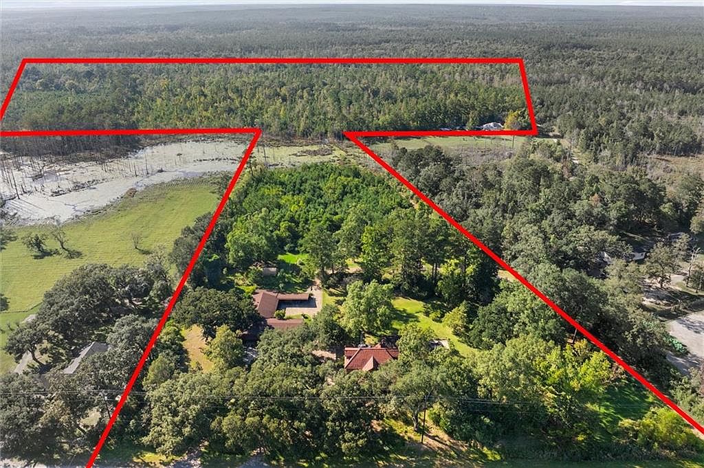 A wide aerial view highlights a large, wooded estate outlined in bold red lines, indicating property boundaries that encompass dense forests, open green fields, and a winding boundary near a wetland area. In the center, clusters of mature trees surround red-roofed buildings, creating a secluded, peaceful retreat among the trees. The structures are distributed with generous spacing, offering privacy and connection to nature. The landscape transitions from manicured lawns and clearings near the house to untamed forest at the edge, emphasizing the property’s extensive acreage and natural, rustic charm.