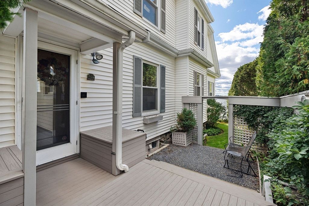 This charming back porch area offers a tranquil transition between the home’s interior and the lush outdoor space. Featuring beige siding complemented by soft gray shutters, the space feels light and inviting. The porch is designed with neutral-toned decking that extends to a small gravel seating nook, where a wrought iron chair sits amid well-maintained greenery. A lattice fence section adds privacy and supports climbing plants, enhancing the garden ambiance. The downspout and clean lines of the trim work harmonize with the classic architecture, while the door with screen lets natural light flow inside, blending practicality with charm.