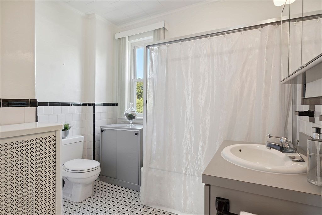 This bathroom features a classic black-and-white color scheme with white subway tiles accented by a black trim that runs horizontally along the walls. The floor showcases a patterned tile design, harmonizing with the overall monochromatic theme. A white toilet is positioned next to a window that brings in natural light, brightening the space. Adjacent to the toilet is a gray cabinet with a glass jar on top, adding subtle decor and storage. The vanity includes a light gray countertop with a white sink and a sleek faucet, complemented by a mirrored medicine cabinet above, providing both functionality and style. A shower with a translucent curtain adds privacy while maintaining light flow throughout the room.