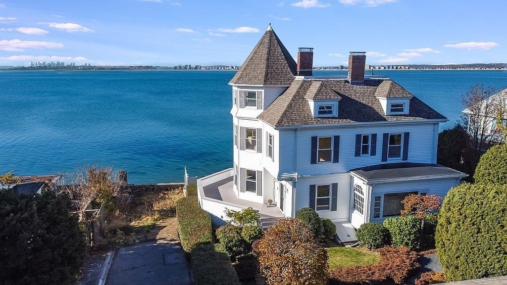 This circa 1900 Queen Anne style waterfront home is located in Nahant, Massachusetts. It masterfully combines historic architectural charm with modern conveniences, offering a unique lifestyle along the ocean with direct beach access and panoramic views of the ocean, sunsets, and the Boston skyline. The property boasts a prime waterfront plot with its own mooring and beautifully maintained grounds featuring perennials, hedges, and trees leading to the front entrance. Architectural highlights include Palladian and leaded windows, original woodwork, and high beam ceilings that emphasize its historic character. The first floor features a fireplaced foyer and living room with ocean views, an ocean-facing sunroom with wrap-around deck access, a dining room overlooking the skyline and ocean, and an oversized butler’s pantry and kitchen with an adjoining garden room. The second floor includes an oceanfront primary suite with sitting room and a spacious bathroom equipped with an oversized Jacuzzi, plus two additional bedrooms and a full bath. The third floor offers four versatile rooms, ideal for various uses. A dry basement provides ample storage and interior/exterior access. The listing price for this exquisite waterfront home is $2,399,000.