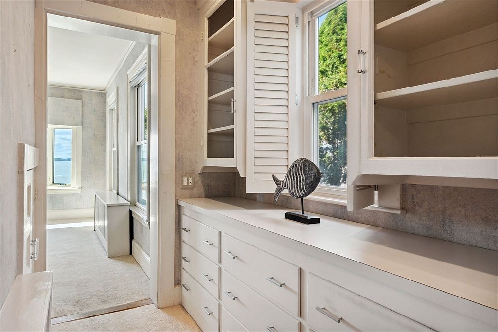 This narrow, well-lit corridor serves as a butler’s pantry or transitional storage area adjacent to a bright living or dining room. The walls and cabinetry are painted in soft off-white tones, complementing the pale neutral carpet floor. The cabinetry features multiple drawers and upper cupboards with shutter-style and glass-paneled doors, providing both concealed and visible storage. A small decorative fish sculpture adds a subtle coastal touch. Large windows on the right allow natural light to flood the space and offer views of lush greenery outside. The overall style is classic and clean, with a focus on function and simplicity.