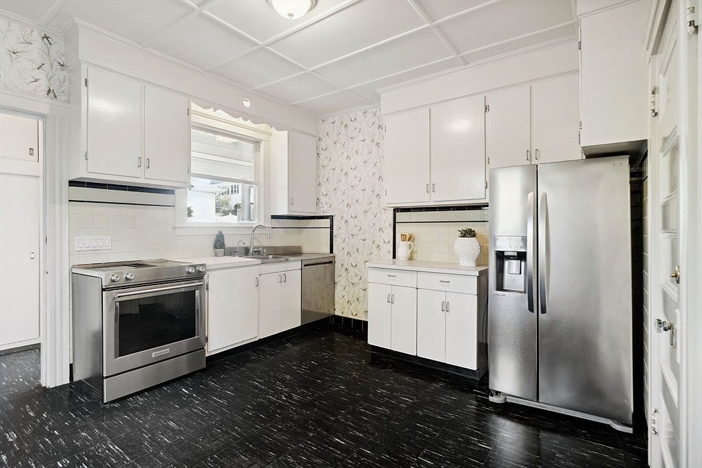 This kitchen blends classic and modern elements with a monochromatic palette. White cabinetry dominates the space, providing ample storage both above and below the countertops. The cabinetry is accented with simple silver handles, complementing the sleek stainless steel appliances, including a side-by-side refrigerator and a modern oven. The black vinyl flooring introduces a striking contrast, grounding the room while echoing the thin black tile border in the backsplash. A large window above the sink allows natural light to brighten the room, highlighting the subtle floral wallpaper on one wall for a soft decorative touch that adds character to the space.