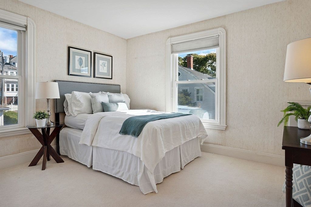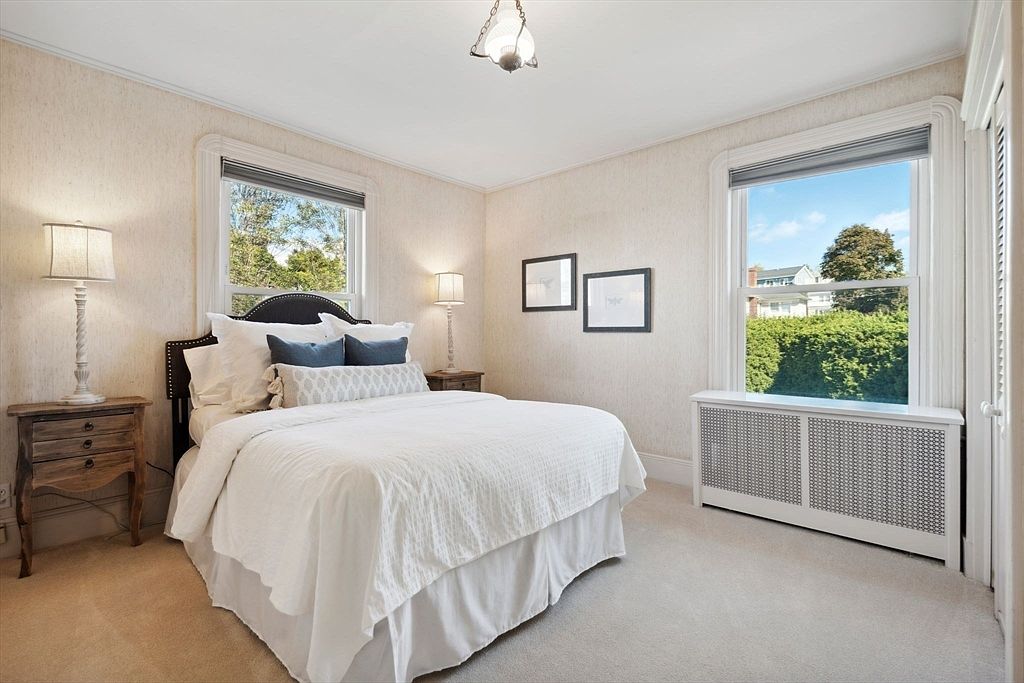 This inviting bedroom features a serene palette of soft neutrals with cream walls and beige carpeting, creating a calm and airy atmosphere. The bed, dressed in crisp white linens, is the focal point, complemented by an upholstered dark headboard accented with nailhead trim. Matching wooden nightstands with rustic finishes flank the bed, each topped with elegant lamps, adding warmth and symmetry. Two large windows provide abundant natural light and frame views of lush greenery outside. Minimalist framed artwork adds subtle character, while a functional radiator cover below one window blends seamlessly with the room’s classic yet cozy aesthetic.