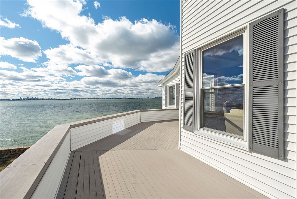 This spacious waterfront deck features clean lines with a light beige decking complemented by white siding and gray shutters on the house exterior. The wraparound design provides an unobstructed panoramic view of the water and distant skyline, ideal for relaxing or entertaining. Elevated railings maintain the openness while ensuring safety, blending harmoniously with the coastal setting. The bright daylight enhances the airy, tranquil atmosphere, making this deck a serene extension of the home that connects indoor living with the natural beauty of the waterfront landscape.