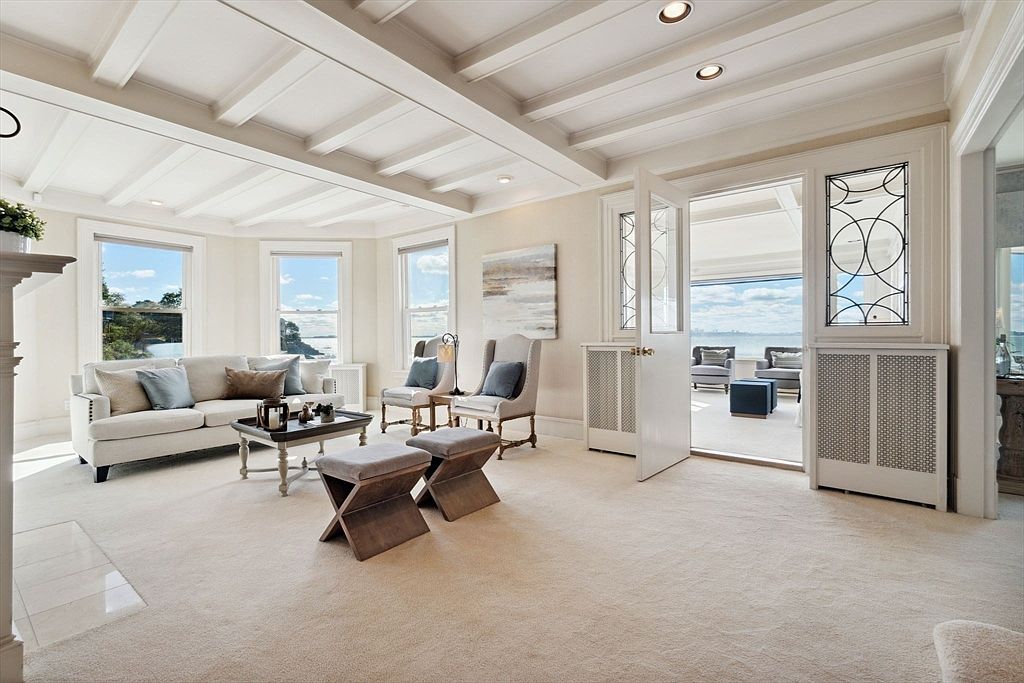 This elegant living room features a soft, neutral color palette with cream walls and carpeting that enhances the natural light streaming through multiple large windows. The ceiling’s exposed beams add architectural interest and a subtle farmhouse charm. Seating includes a sleek, light-colored sofa adorned with pale blue and gray accent pillows, paired with two classic armchairs upholstered in a neutral fabric. Two stylish wooden ottomans provide additional seating or footrests. A central coffee table sits on the carpet, contributing to the room’s airy and inviting ambiance. French doors open to a sunroom with bay windows showcasing beautiful views, adding depth and openness to the space.