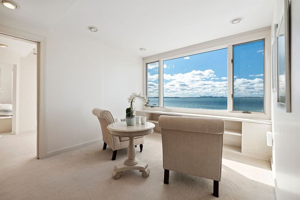 This serene sitting area features a neutral color palette dominated by soft beige and white tones, which complement the bright natural light flooding in through a large picture window. The window frames a stunning waterfront view, creating a peaceful and inviting atmosphere. Two comfortable upholstered armchairs in light beige are positioned around a small round wooden table with classic detailing and a distressed white finish. The room’s simple design is enhanced by clean white walls and carpeting, minimal recessed lighting, and built-in shelving beneath the window, offering subtle storage without detracting from the expansive view.