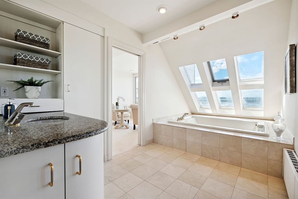 This bright and airy bathroom features a sunken tub positioned beneath four large skylights set in a sloped ceiling, inviting natural light and providing a peaceful view of the sky. The tub surround is tiled in neutral beige tones, complementing the light tiled floor that ties the space together. A sleek granite countertop with built-in sink is adjacent to the bathtub, with white cabinetry adorned with gold-tone handles below. Open shelving with woven baskets and a small green plant add practical storage with subtle decorative charm. The space flows seamlessly into a light-filled adjoining room through a wide doorway, emphasizing openness and an uncluttered aesthetic.