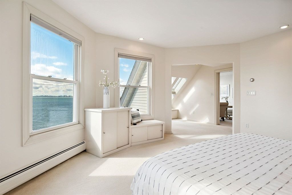 This serene bedroom features a bright, airy layout with large windows offering stunning water views. The walls and carpeting are a soft, neutral off-white, enhancing the natural light that fills the space. A white storage cabinet and built-in bench sit beneath the windows, topped with a simple vase of flowers and decorative cushions, blending functionality with minimalist charm. The adjacent room is visible through a wide entryway, suggesting an open-plan design. The overall aesthetic is clean and calming, with subtle architectural details like the sloped ceiling and recessed lighting contributing to the peaceful ambiance.