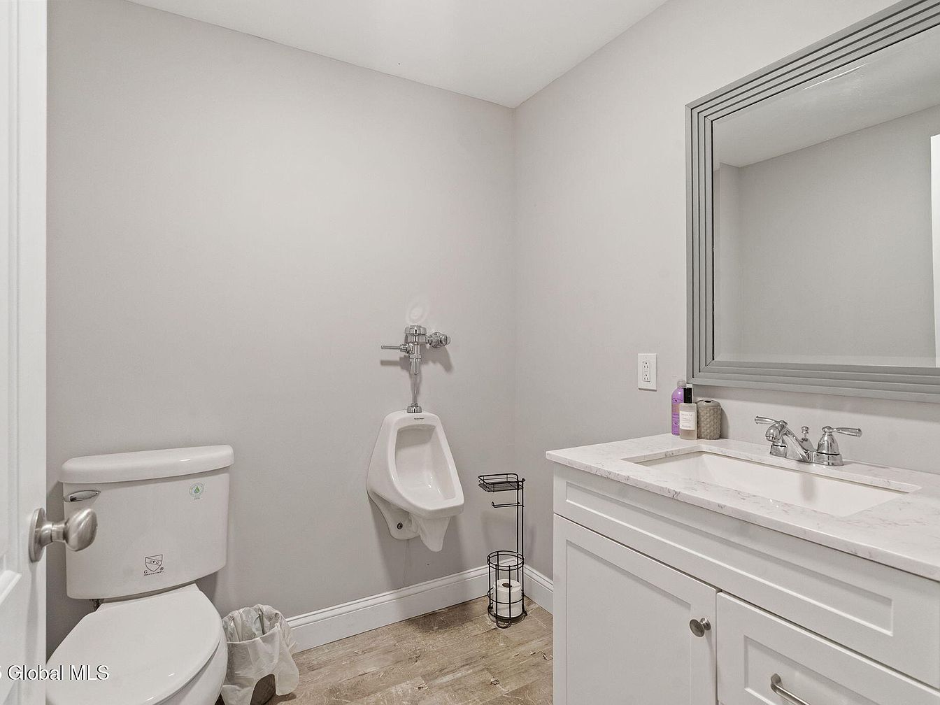 This compact bathroom features a minimalist and modern design with neutral gray walls complemented by white fixtures. A standard white toilet is positioned next to a wall-mounted ceramic urinal, adding a unique touch to the space. The vanity has a white shaker-style cabinet with sleek silver hardware, topped with a white marble countertop housing an under-mount sink and a chrome faucet. Above the sink, a large rectangular mirror with a multi-layered gray frame enhances the sense of depth and light. The flooring consists of wood-look planks in soft natural tones, further softening the clean, functional aesthetic. Overall, the design focuses on simplicity, functionality, and modern comforts.