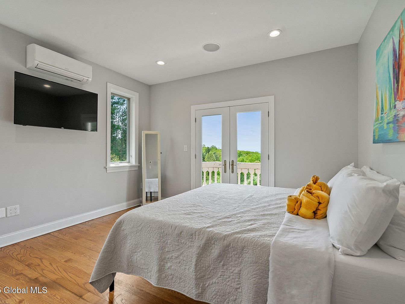 This bedroom features a clean and serene design with soft gray walls complemented by white trim that adds to the crisp, modern feel. The medium-tone hardwood floor brings warmth, while large French doors open to a balcony offering a scenic view of lush greenery. The bed is dressed in white quilted bedding with neatly folded mustard yellow towels providing a lively pop of color. A wall-mounted flat-screen TV is positioned opposite the bed, and a slender, full-length mirror stands near a narrow window allowing natural light to brighten the room. Recessed ceiling lights add a subtle, streamlined illumination.