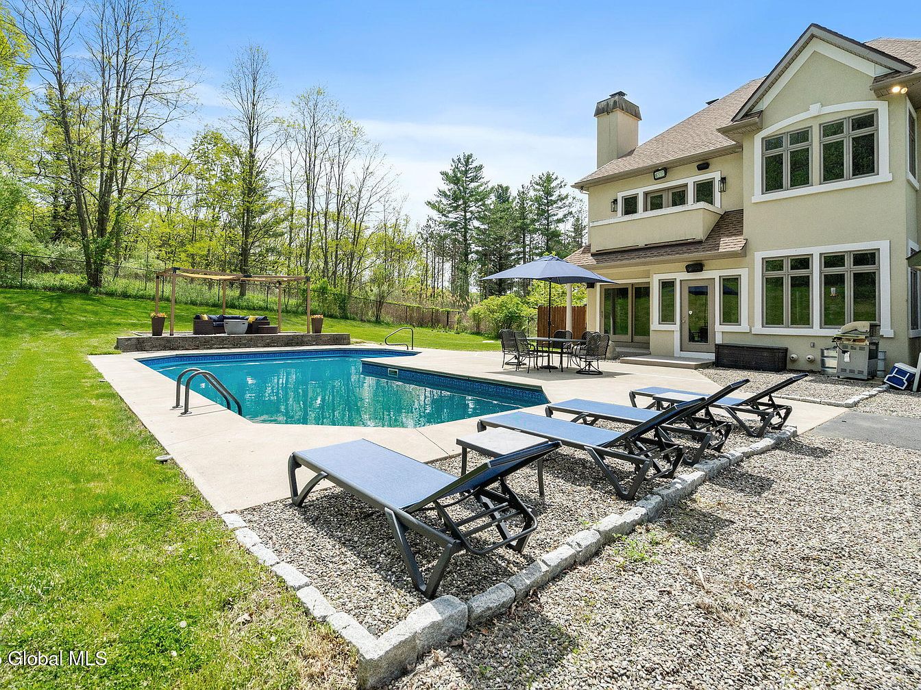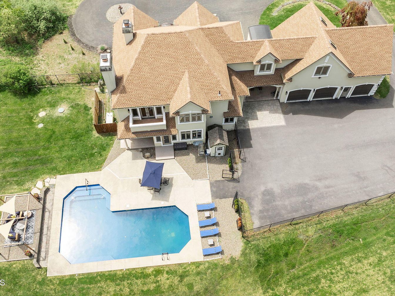 This expansive backyard features a large, uniquely shaped swimming pool bordered by a clean, light concrete deck. Four blue lounge chairs line one side, perfect for sunbathing. The adjacent patio area showcases a central table with a navy blue umbrella, offering shaded outdoor seating. To the left, a more intimate pergola-covered seating space with beige fabric provides a cozy retreat, accented with outdoor rugs and cushions. The home’s exterior sports a warm beige stucco finish with white trim and a multi-gabled roof in tan shingles, complementing the natural green lawn surrounding the space. A spacious driveway and three-car garage add convenience.