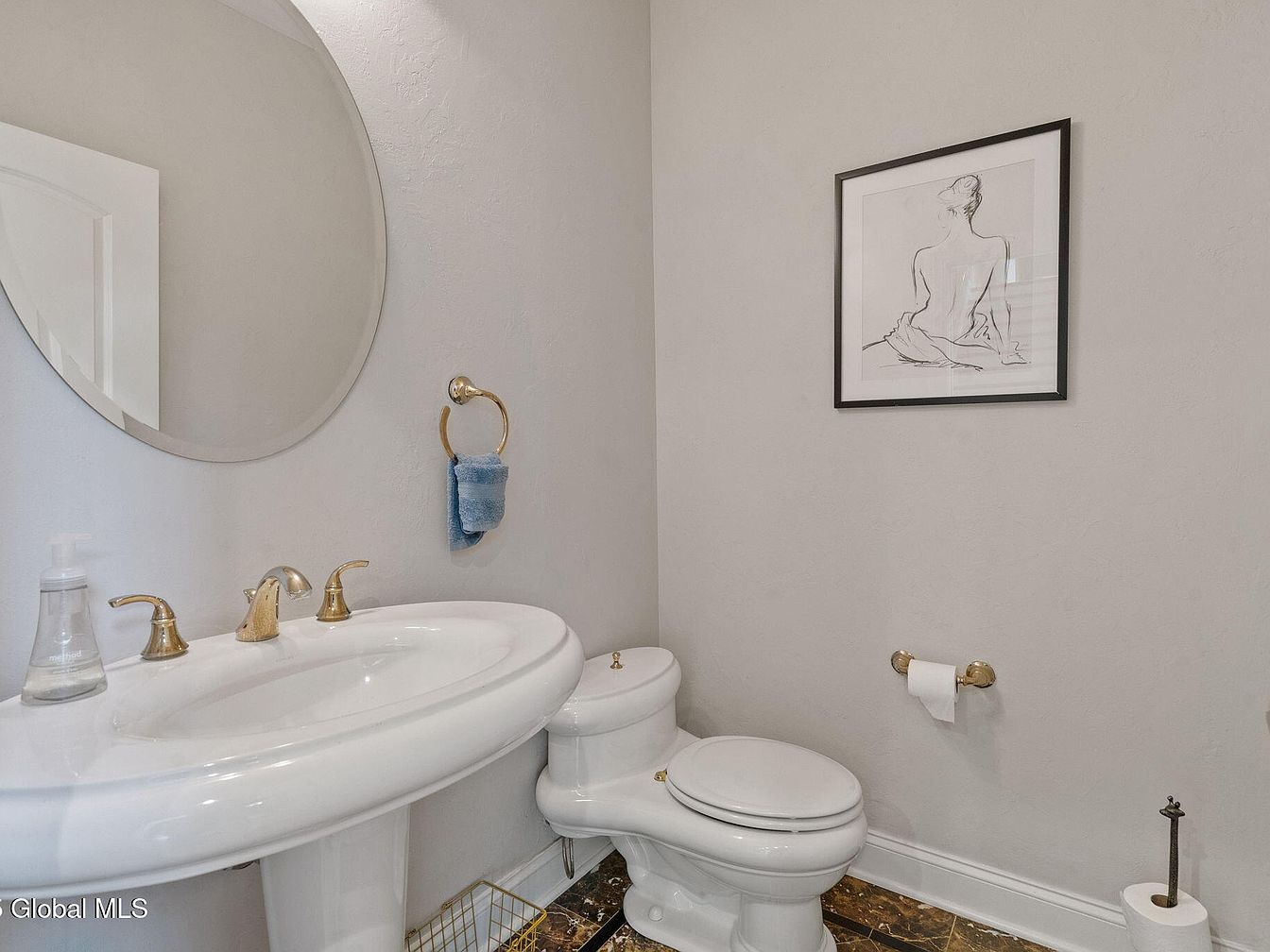 This powder room boasts a compact and efficient layout with classic design touches. The space is painted in a soft neutral gray, creating a calming atmosphere. A white pedestal sink with vintage-inspired gold-tone faucet fixtures serves as the focal point, complemented by a matching gold towel ring holding a blue hand towel. The walls feature a simple black-framed line art sketch of a seated figure, adding an elegant artistic element. The toilet is a traditional style with a rounded tank. The floor is adorned with dark, marbled tiles that provide a rich contrast to the light walls and fixtures.