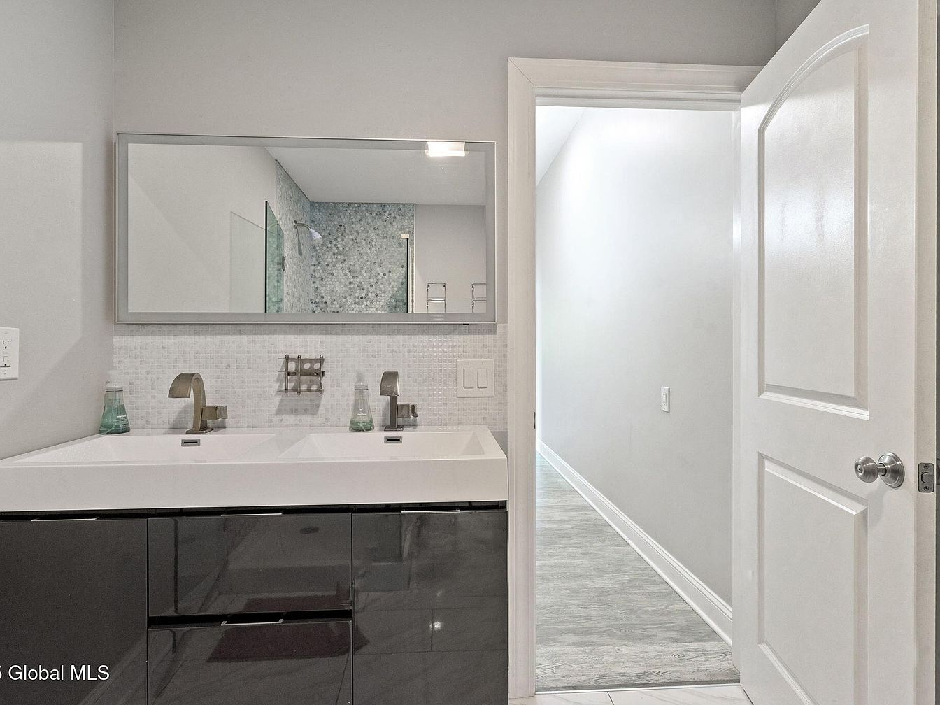This bathroom features a sleek modern vanity with a double sink setup, framed by a large rectangular mirror that extends the length of the countertop. The faucets have a brushed metal finish, complementing the glossy black cabinetry below, which offers ample storage. Above the vanity, delicate mosaic tile backsplash adds subtle texture and visual interest with its muted gray and white tones. Neutral wall colors contribute to a clean and airy feel, while a white door leading to a hallway with light wood floors creates a seamless transition between spaces. The overall design emphasizes simplicity and functionality.