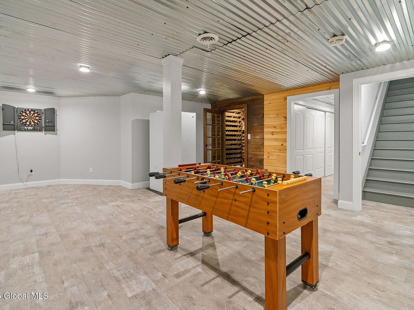 This spacious basement recreation area offers a casual, inviting atmosphere with a mix of practical and fun elements. The room features light-colored wood-patterned flooring that enhances brightness against the soft gray walls and ceilings made with a corrugated metal texture. At the center, a classic wooden foosball table invites entertainment, while a dartboard mounted on the far wall adds a playful touch. The exposed column and framed stairway enhance architectural interest. A warm wooden accent wall leads to a door revealing a wine cellar, blending leisure and style with subtle sophistication.