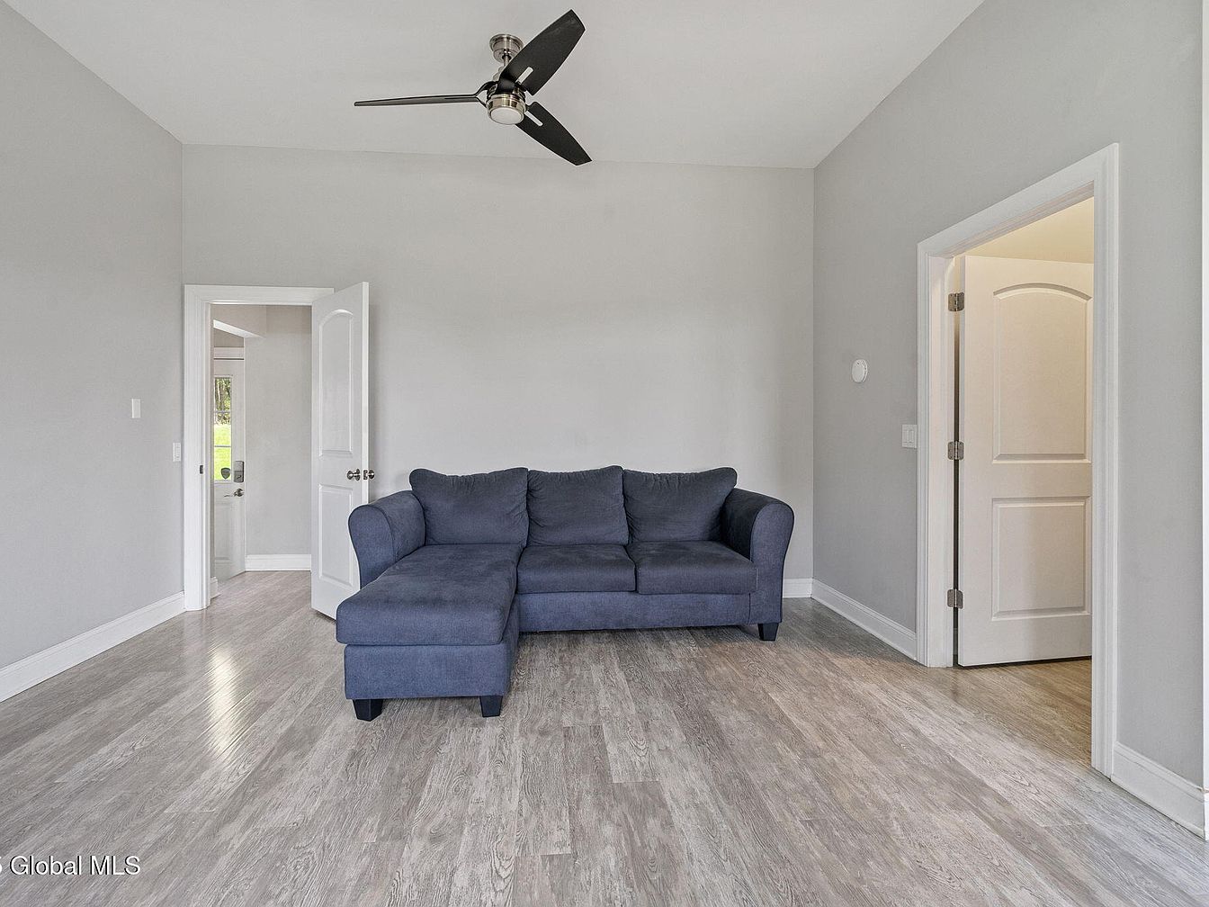 This cozy living room corner features a plush dark blue sectional sofa positioned against a light gray wall, creating a striking contrast. The floor is covered with light wood-grain laminate, enhancing the room’s bright and airy feel. Simple white trim and baseboards add clean architectural detail, while two white doors lead to adjacent rooms, emphasizing functionality and flow. A sleek black and silver ceiling fan with modern design hangs from the ceiling, integrating contemporary style and practical ventilation. The space radiates a minimalist and modern aesthetic, focused on comfort with restrained, neutral color choices.