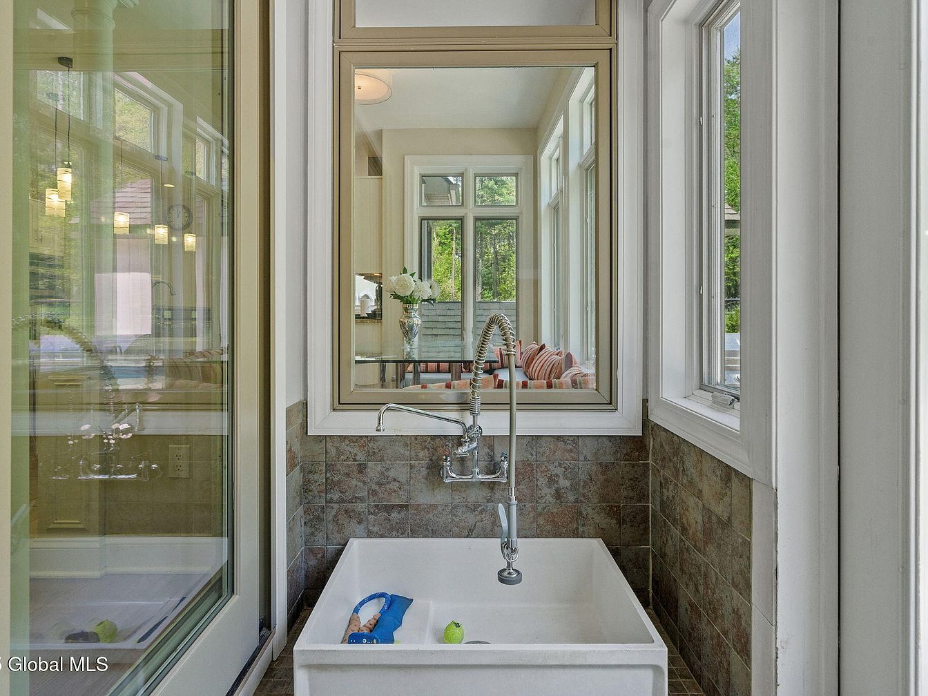 This compact utility or laundry sink area is designed for practicality with a deep white basin perfect for soaking or washing larger items. The space is neatly framed by beige-gray-toned ceramic tiles that bring an earthy feel alongside crisp white window trims and walls. A high-arc industrial-style faucet with a flexible hose adds a modern touch and functionality. Large windows on two sides allow an influx of natural light and offer views of a cozy living area beyond, featuring soft seating and floral arrangements, merging utility with warm, inviting aesthetics.