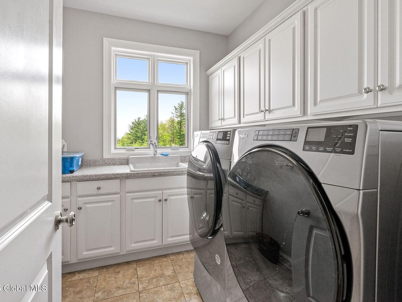This laundry room features a clean and functional layout with a pair of sleek, modern front-loading washer and dryer units in a metallic finish. The room is brightened by natural light streaming through a large, divided window above a farmhouse-style utility sink, framed by white cabinetry that runs along one wall. The cabinets provide ample storage both above and below the granite countertop, blending practical use with a polished look. The neutral color palette of soft whites and grays complements the natural stone tile flooring, creating an inviting yet practical space for household chores.