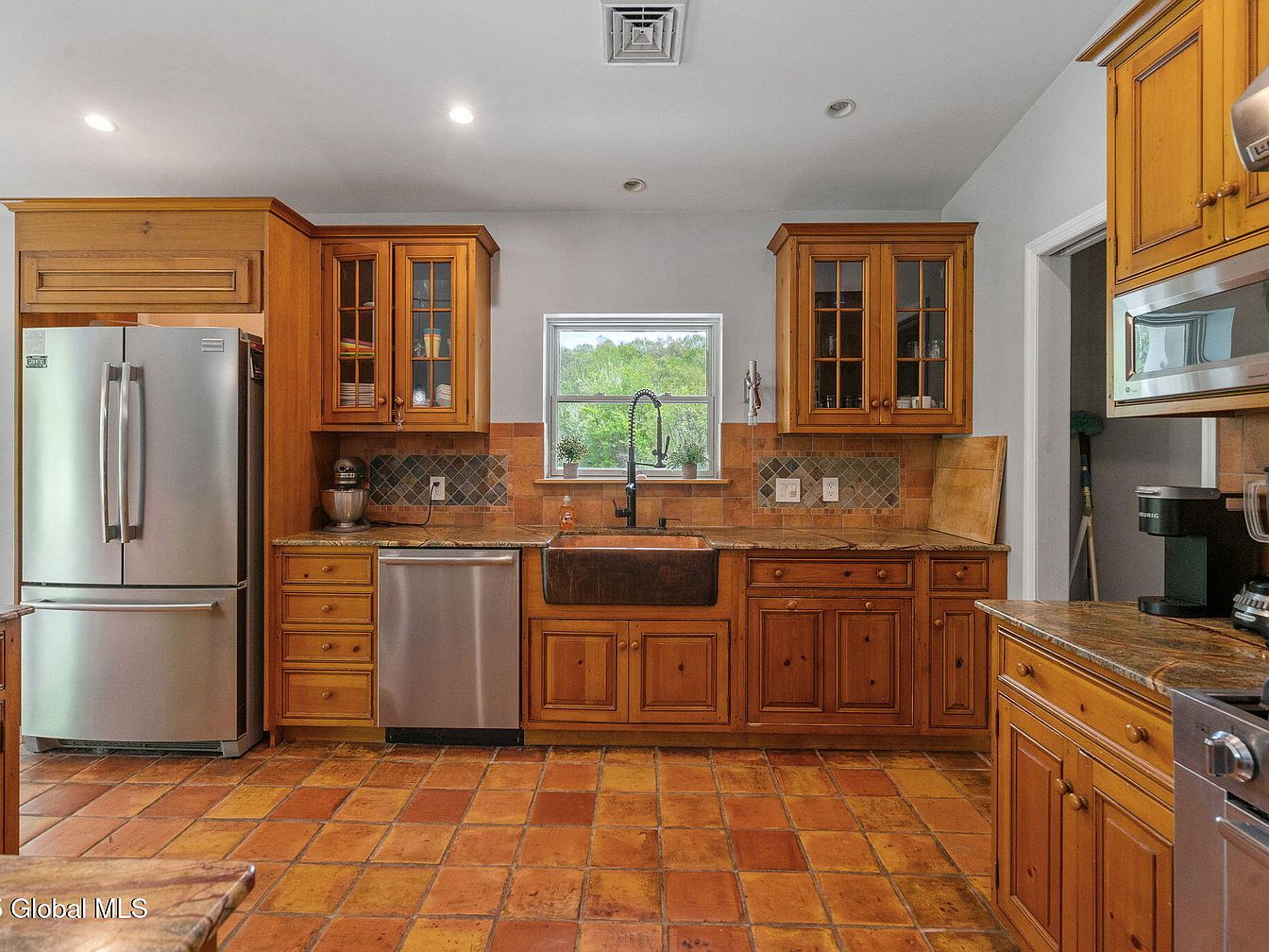 This kitchen features a warm, rustic aesthetic with natural wood cabinetry dominating the layout. The floor is covered in terra-cotta tiles that enhance the earth-toned theme. The countertops are granite with subtle patterns, complimenting the wooden cabinets and drawers. A large farmhouse-style copper sink sits beneath a window, bringing in natural light and framing a view of greenery outside. Stainless steel appliances, including a refrigerator, dishwasher, microwave, and oven, add a modern touch. Glass-paneled cabinet doors display neatly arranged dishes, and tile backsplash with diamond patterns adds texture. Recessed lighting provides even illumination.
