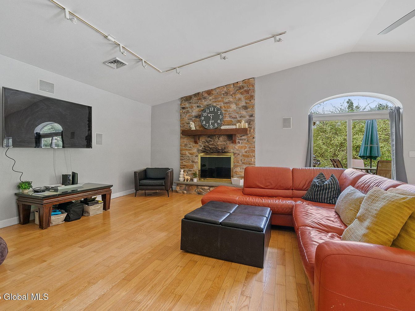 This living room features a spacious, open layout with light wood flooring and soft gray walls that create a neutral backdrop. The focal point is a rustic stone fireplace topped with a wooden mantel, adorned with a classic black clock and tasteful decor accents. A large, L-shaped burnt orange leather sectional contrasts warmly with the otherwise muted palette, complemented by multi-textured throw pillows. Opposite the fireplace, a wall-mounted flat-screen TV above a wooden console adds modern convenience. Soft natural light streams through a wide, arched sliding glass door, connecting the indoor space to a lush backyard patio, enhancing the room’s inviting atmosphere.