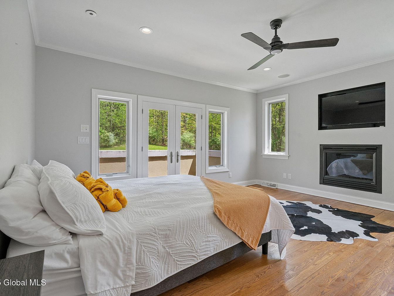 This master bedroom features a serene and modern design with soft gray walls that create a calm ambiance, balanced by rich natural wood flooring. A large bed is dressed in white textured bedding with a pop of warm orange accents through a blanket and folded towels, injecting subtle color. Floor-to-ceiling French doors, flanked by tall windows, invite abundant natural light and offer views of lush greenery outside. A sleek black ceiling fan adds a contemporary touch overhead, while a built-in fireplace and a wall-mounted flat-screen TV provide comfort and entertainment, complemented by a striking black and white animal-print rug for visual interest.