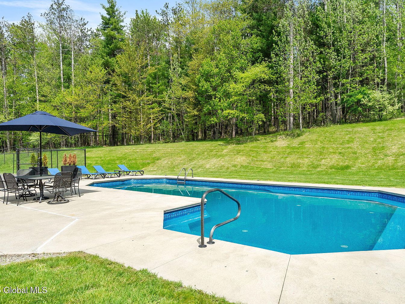 This serene backyard features a cleanly designed in-ground swimming pool surrounded by a wide concrete deck offering ample space for lounging and outdoor dining. A sleek metal handrail provides easy pool access, while a round dining table with six perforated metal chairs, shaded by a large navy umbrella, invites relaxation and social gatherings. Blue cushioned lounge chairs line the perimeter, enhancing comfort and style. Lush green grass and a backdrop of mature trees create a peaceful, private setting that blends natural beauty with functional outdoor living.
