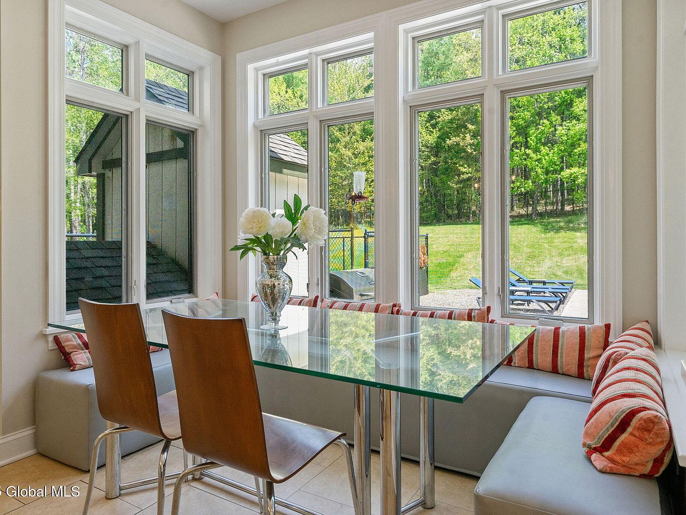 This cozy breakfast nook is nestled within a corner, surrounded by tall, expansive windows that flood the space with natural light and offer calming views of the green backyard. The seating arrangement features a built-in bench wrapped in light gray upholstery with striped red, beige, and white cushions adding a warm pop of color. Complementing the bench are two sleek wooden chairs with chrome legs, paired with a modern rectangular glass table that reflects the natural surroundings. The cream-colored walls and tiled floor serve as a neutral backdrop, balancing the nook’s clean, bright, and inviting aesthetic.