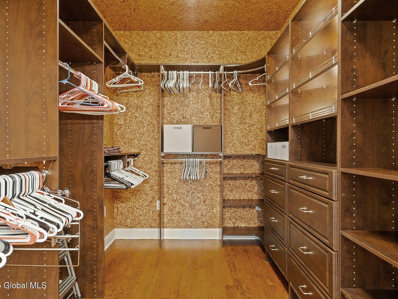 This spacious walk-in closet features custom wood cabinetry in a rich, dark finish complemented by a warm oak floor and textured wall paneling that adds depth and character. The layout includes multiple hanging rods for clothes, adjustable shelves, and sliding drawers with sleek metal handles that enhance organization. Clever use of vertical space maximizes storage with dedicated spots for boxes and folded items. The neutral earth tones create a cozy atmosphere while maintaining practicality. Multiple empty hangers and cubbies highlight the closet’s capacity, designed for efficient, stylish wardrobe management.