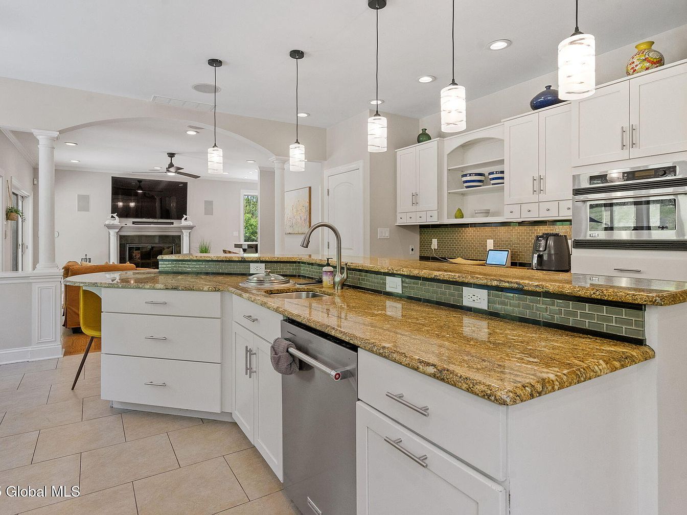 This kitchen features a large, multi-level island with warm granite countertops that complement the white cabinetry. The island incorporates a built-in sink and dishwasher, making it a functional space for meal prep and cleanup. Above, five cylindrical pendant lights hang, casting soft light on the island’s surface. The backsplash is tiled in a muted green glass subway pattern that adds subtle color and texture. White cabinets with sleek silver handles surround the area, while open shelving displays decorative bowls. Through an arched opening supported by classical columns, the adjacent living room with a fireplace and mounted TV can be seen, blending traditional and modern styles.