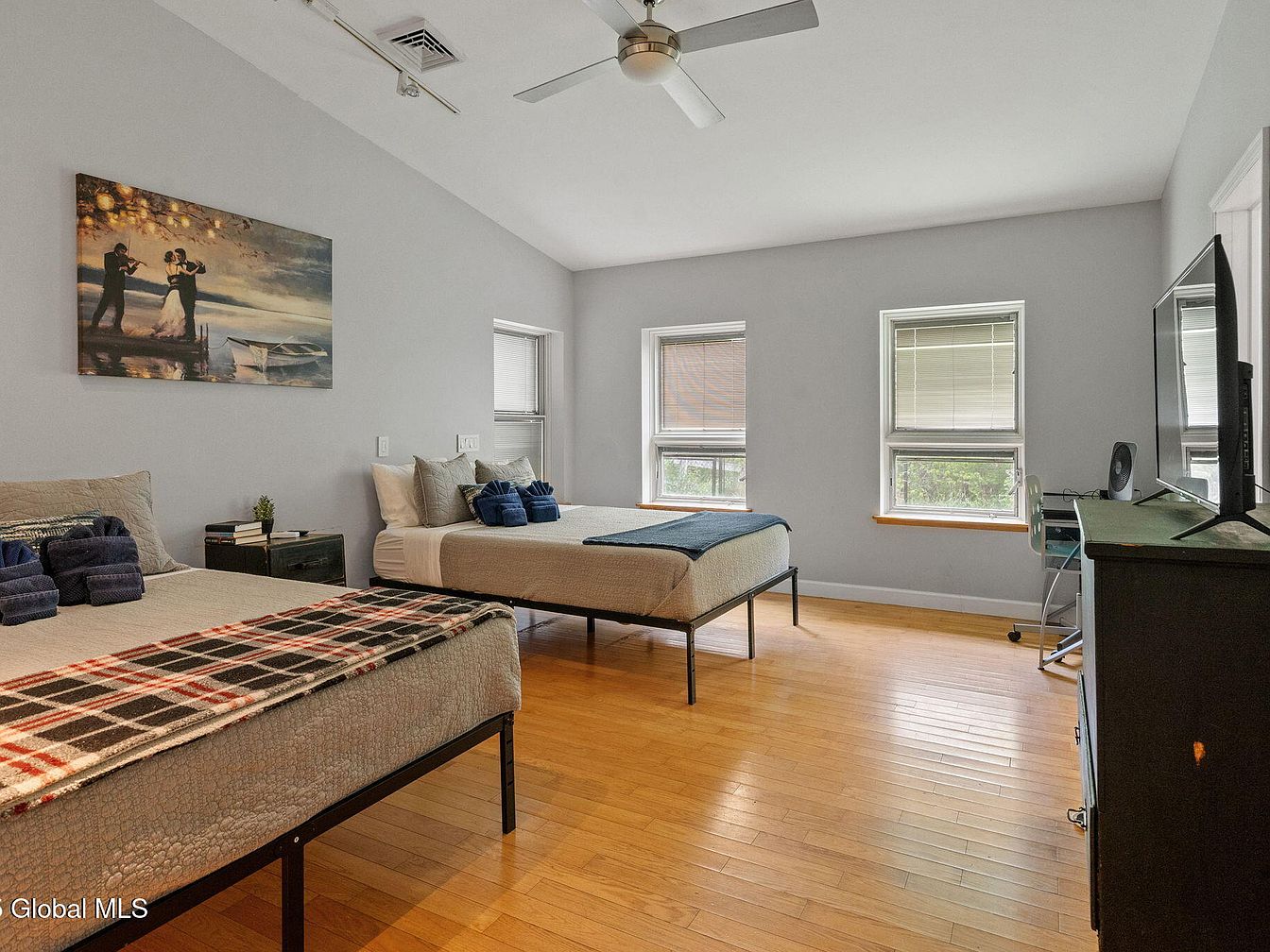 This guest bedroom features a clean, modern design with soft gray walls that complement the natural warm tone of the hardwood flooring. Two metal-framed beds are arranged side by side, each dressed in neutral-toned bedding with accent throws in navy blue and plaid, adding subtle pattern and color depth. Three windows on the far wall allow natural light to fill the space, while horizontal blinds provide privacy. Minimalist furniture includes a small dark nightstand and a dark dresser housing a flat-screen TV and a compact desk with a rolling chair, perfect for functional comfort. A white ceiling fan enhances air circulation in this airy, welcoming room.