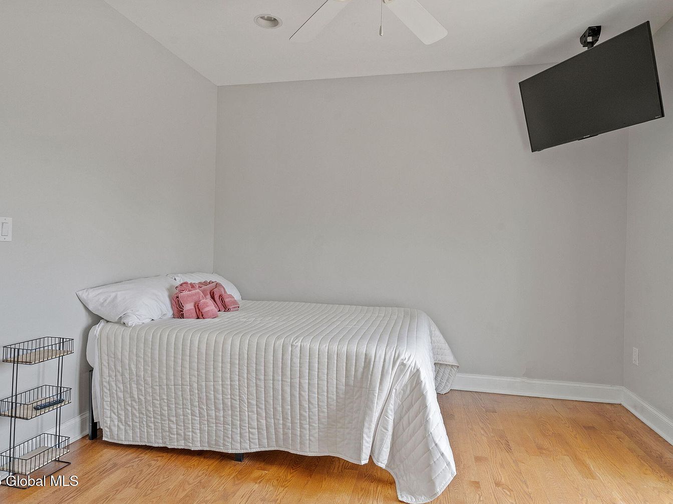 This compact bedroom features a minimalist layout with soft gray walls creating a calm and neutral backdrop. A twin bed dressed in a white quilted bedspread anchors the space, enhanced by neatly folded pink towels adding a subtle touch of color and warmth. The floor is a warm wood tone, complementing the light wall color and bringing natural texture to the room. Mounted in the corner across from the bed, a flat-screen TV is positioned for comfortable viewing. A small wireframe shelving unit offers practical storage, emphasizing the room’s simplicity and its functional, uncluttered ambiance.