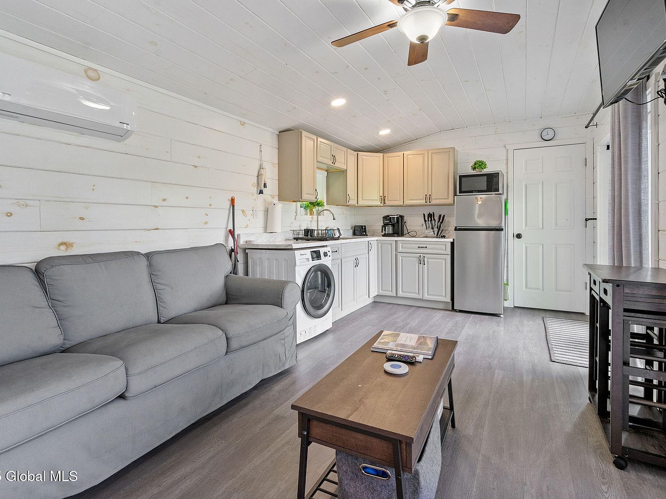 This cozy multifunctional space combines a small living area with a compact kitchen. The white shiplap walls and ceiling create a bright and airy atmosphere, complemented by soft grey wood-look flooring. A comfortable grey upholstered sofa sits against one wall, ideal for relaxation. The kitchen features cream-colored shaker cabinets with black hardware, a white countertop, and modern appliances including a stainless steel refrigerator and a washing machine cleverly integrated below the counter. A ceiling fan with wooden blades offers air circulation, while recessed lighting brightens the space. A mounted TV and a small wooden coffee table complete the streamlined, functional design.