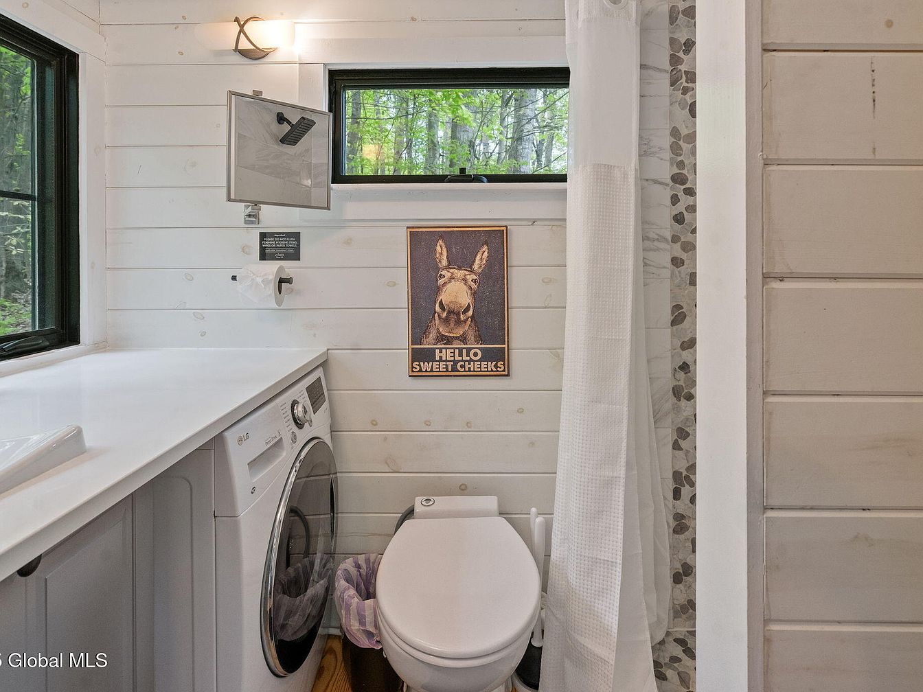 This compact yet functional bathroom cleverly integrates laundry appliances under a white countertop, optimizing space. The walls are clad in horizontally laid whitewashed wood planks, creating a bright, airy ambiance softened by natural light streaming through two black-trimmed windows. The space features a modern white toilet adjacent to a shower, which is partially visible behind a white waffle-textured curtain. Pebble stone detail is seen within the shower niche, adding texture and natural tones that complement the wood floor. A whimsical “Hello Sweet Cheeks” donkey print adds a playful, personalized touch to this fresh, efficient washroom design.