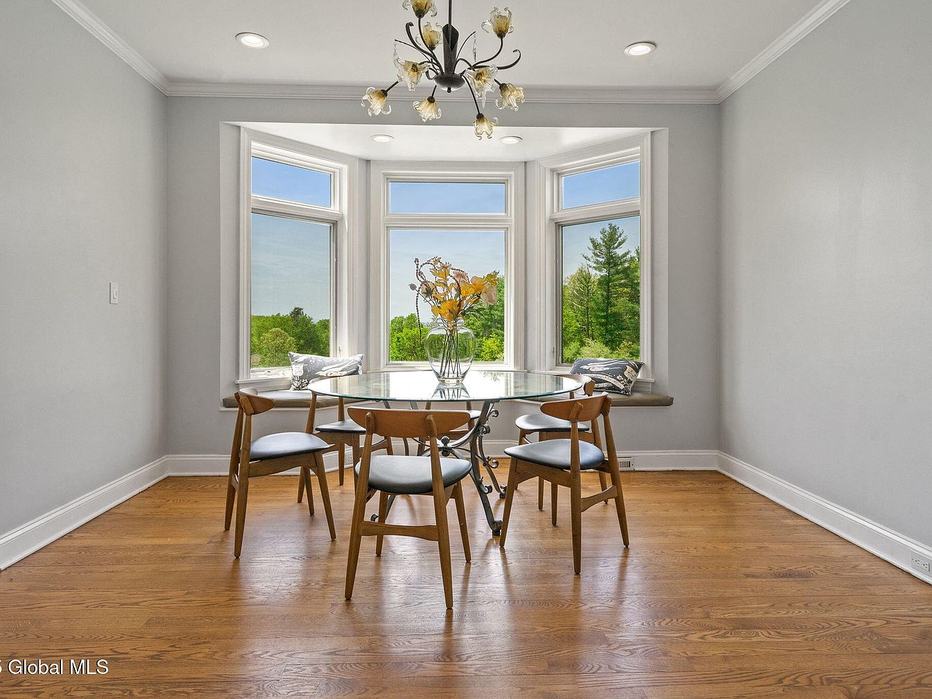 This inviting dining nook features a charming bay window that floods the space with natural light and offers picturesque views of lush greenery. The walls are painted a soft, neutral gray that complements the warm honey-toned hardwood floors. A round glass table with an ornate black metal base anchors the seating area, surrounded by five mid-century modern wooden chairs with black cushioned seats. The cozy window seat is accented with patterned gray and white pillows, providing additional seating or a quiet spot to enjoy the view. A delicate floral chandelier hanging from the white ceiling adds a touch of elegance and warmth to the serene setting.