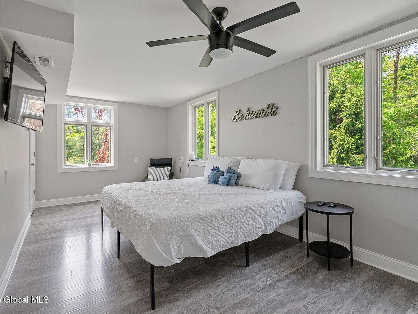 This master bedroom features a minimalist and serene design with soft gray walls and wood-look flooring that adds warmth. A large bed dressed in crisp white bedding stands centrally, accompanied by small blue accent pillows adding subtle color. The room is bright and airy, boasting multiple large windows that offer expansive views of lush greenery outside. A sleek black ceiling fan provides both style and function. Opposite the bed, a wall-mounted flat-screen TV maximizes space. A modern black side table and a cozy chair by the corner window complete this peaceful retreat.