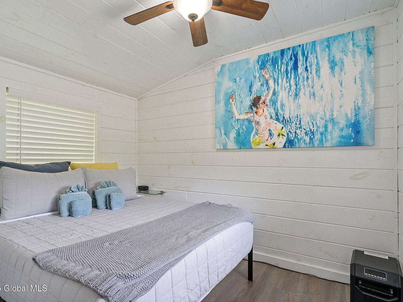 This compact bedroom features white-painted horizontal wood paneling that brightens the space and adds a rustic charm. The bed is neatly dressed in soft gray bedding with a textured throw blanket at the foot, accompanied by pillows in muted tones of gray, blue, and a subtle pop of yellow. A glass nightstand with a small clock sits beside the bed, emphasizing simplicity. Above the bed, a large, vivid painting of a woman in a pool introduces vibrant blues and an airy feel, contrasting with the neutral palette. A ceiling fan with wooden blades adds warmth and practical comfort.
